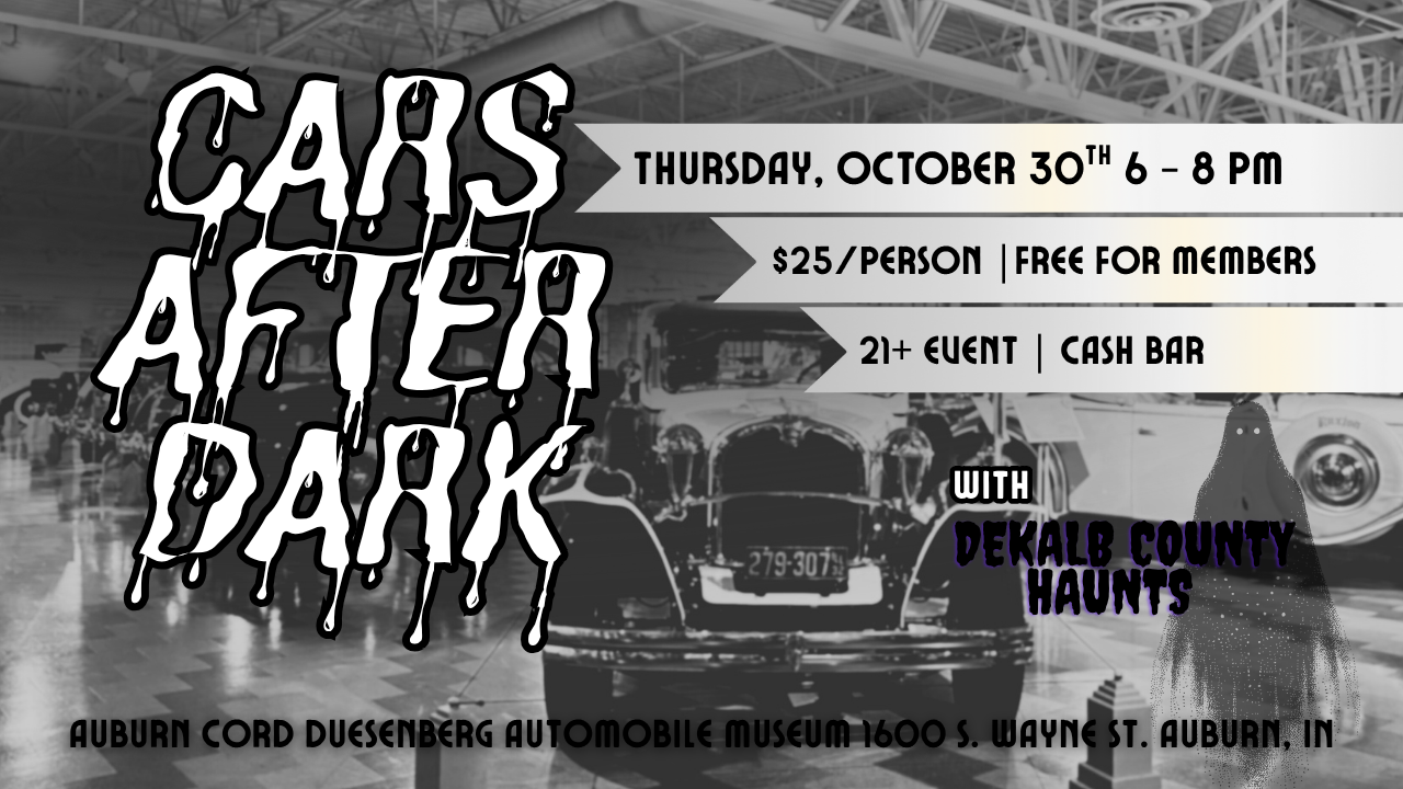 As night falls, explore the museum’s darkened galleries from 6:00–8:00 PM, drink in hand, as we share eerie tales and haunted histories connected to the classic cars on display.